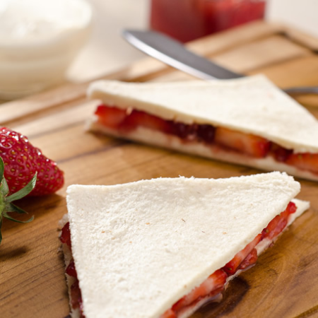 En una tapa, ponle jalea de fresa y el la otra, queso crema.