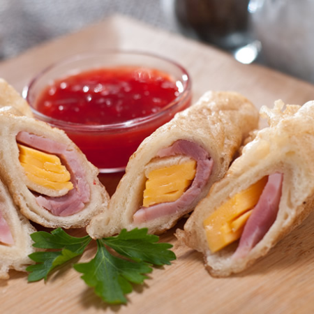 - Ponle una lasca de jamón y una de queso en el centro y enrolla el pan.