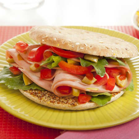 - Distribuye la mostaza y la mayonesa en ambas tapas de los thins y agrega dos rebanadas de pastel de pavo en cada uno.