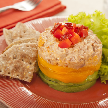 - Salpimentar las rebanadas de aguacate y con ayuda de un aro o molde redondo sin fondo, colocar el aguacate, posteriormente colocar las láminas delgadas de mango y por ultimo rellenar con el atún con aderezo. Dejar reposar 5 minutos para poder desmoldar.