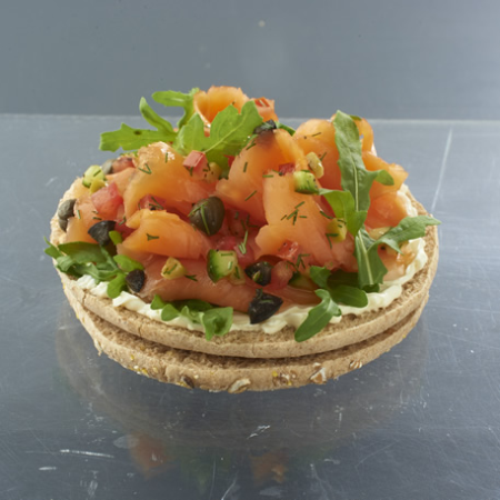 - Coloca la arúgula sobre las thins y encima coloca el salmón ahumado.