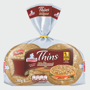 Sándwich Thins es un novedoso pan fino, circular, tierno, ligero con todos los beneficios del grano entero, lo que lo convierte en una excelente opción para comer ligero.